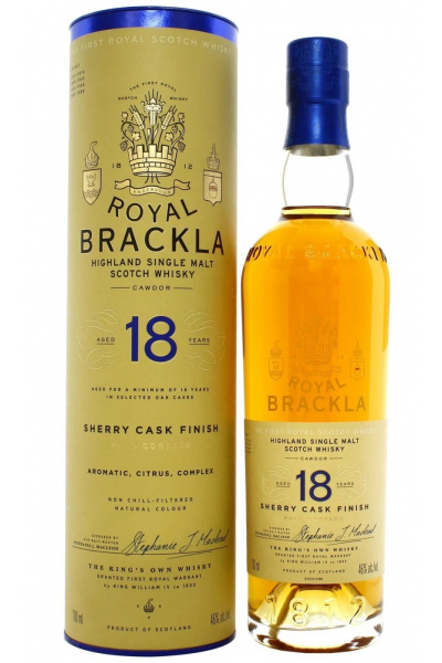 Royal Brackla 18 years old is een goudkleurige single malt whisky afkomstig uit de regio Highland in Schotland. De whisky heeft minimaal 18 jaar mogen rijpen op eikenhouten vaten en heeft vervolgens nog een finish op sherry vaten gehad. Het aroma die in de neus naar bovenkomt, is licht zuur met tonen van citrus en honing gevolgd door noten en amandelen. Je proeft een fruitige smaak met tonen van citrus en mandarijn gepaard met kruiden en exotische vruchten. De afdronk is middellang met tonen van citrus en sherry in combinatie met noten. Hij heeft een alcoholpercentage van 46%.